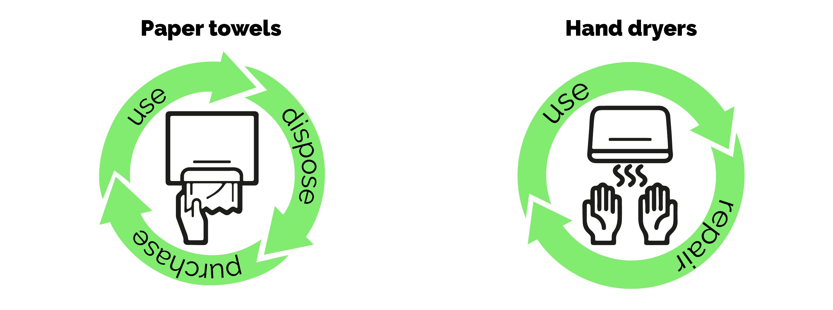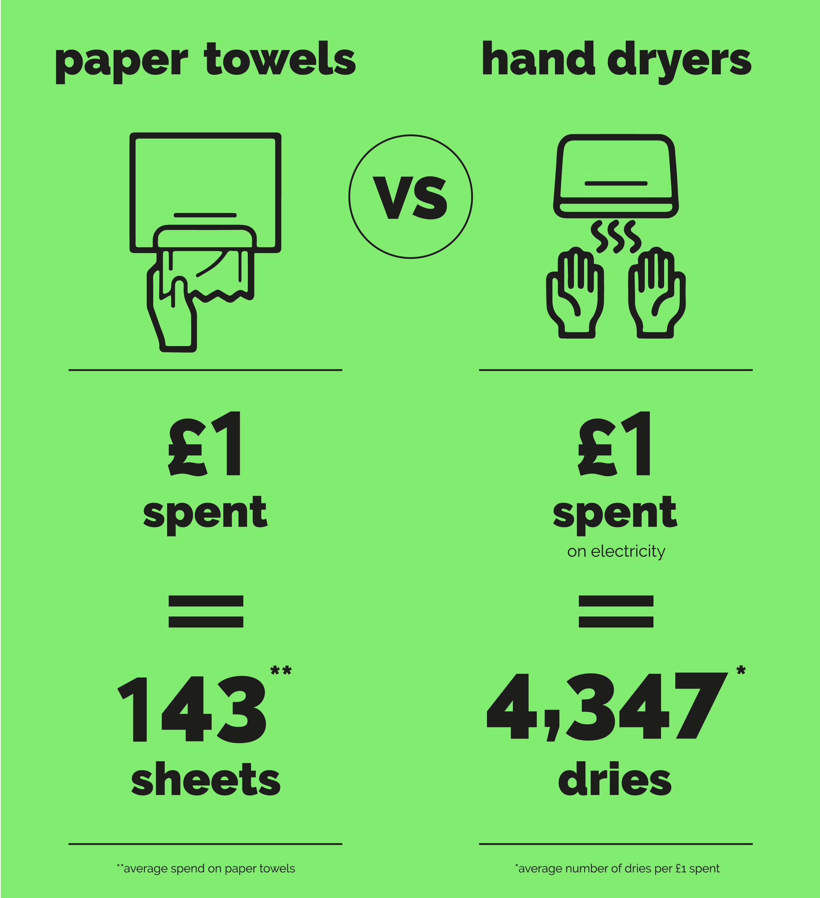 As well as being better for the environment hand dryers are roughly 95% LESS expensive than paper towels. Paper towels are an expensive, messy washroom solution, with the continual need for fresh supplies, thousands are spent annually in purchase, cleaning, maintenance and disposal when using paper towels.